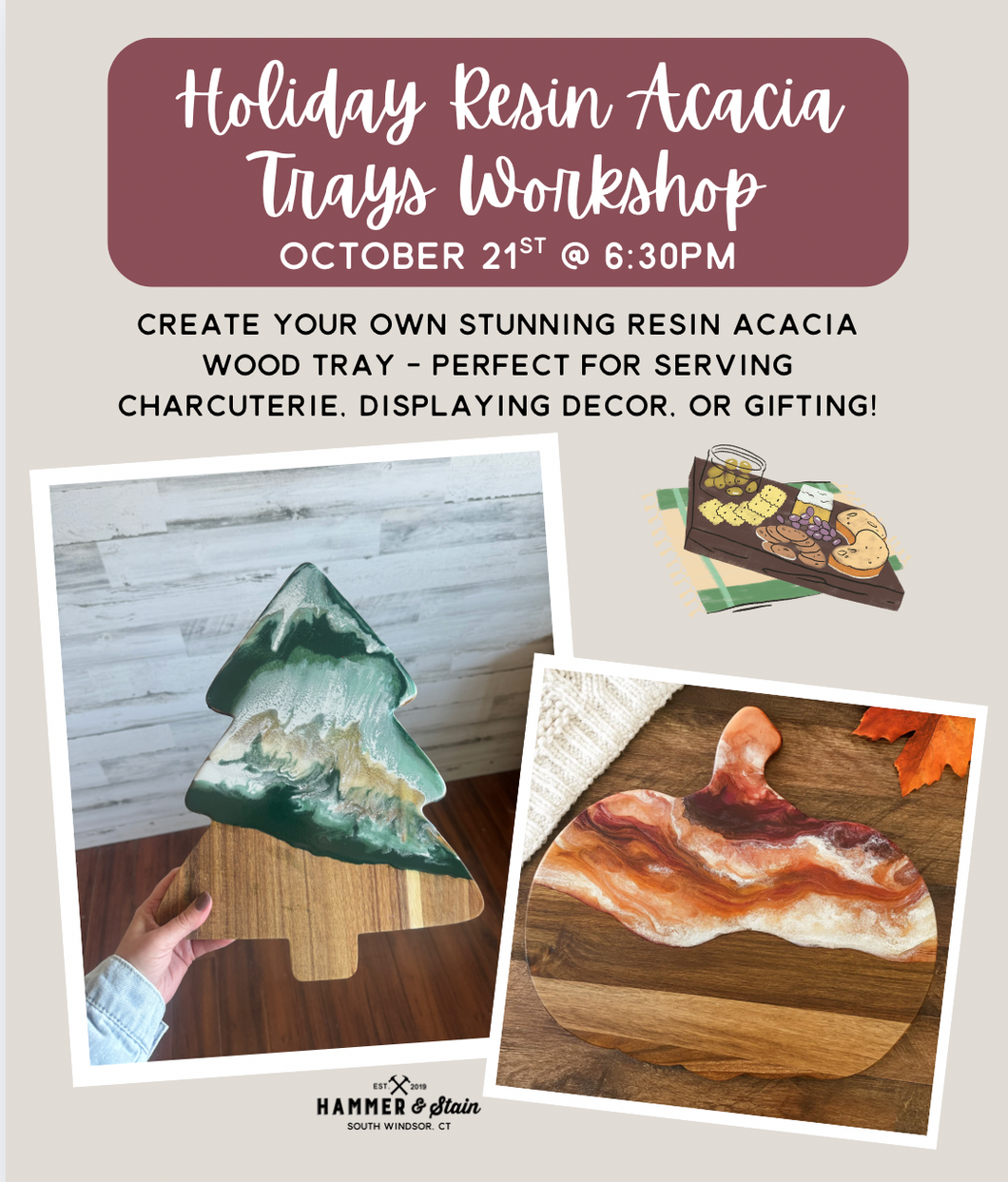Join us Tuesday, October 21st @ 6:30 for our RESIN ART workshop where you can make your own DIY Resin Art Acacia Wood Cutting Boards! We will teach you step-by-step how to create your own gorgeous project - these projects make for great handmade gifts for someone special or keep for yourself! THIS CLASS WILL MAX AT 16 spots.